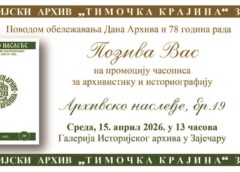 Istorijski arhiv „Timočka krajina“ Zaječar danas obeležava 78-godišnjicu postojanja. Tim povodom, Arhiv će predstaviti javnosti 19. broj časopisa za arhivistiku i istoriografiju „Arhivsko nasleđe“. Promocija je zakazana u 13 časova, u galeriji Arhiva.