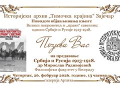 Istorijski arhiv „Timočka krajina“ Zaječar organizuje predavanje pod nazivom „Srbija i Rusija 1913-1918.“ dr Miroslava Radivojevića, višeg naučnog saradnika na Odeljenju za istoriju Filozofskog fakulteta u Beogradu. Predavanje je zakazano za četvrtak, 26. februar 2026. godine, sa početkom od 13 časova, u galeriji Arhiva.