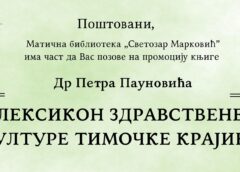 U čitalištu Matične biblioteke „Svetozar Marković“ u Zaječaru, u četvrtak, 9. oktobra, biće organizovana promocija knjige dr Petra Paunovića pod nazivom „Leksikon zdravstvene kulture Timočke krajine“. Na promociji će govoriti autor knjige, dok će moderator biti Tamara Brajković. Početak je u 18 sati