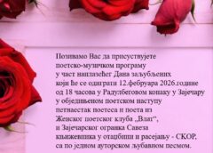 Poetsko-muzički program povodom Dana zaljubljenih biće održan 12. februara 2026. godine od 18 časova u Radul-begovom konaku u Zaječaru. U objedinjenom poetskom nastupu petnaestak poetesa i poeta iz Ženskog poetskog kluba „Vlat“ i zaječarskog ogranka Saveza književnika u otadžbini i rasejanju – SKOR, sa po jednom autorskom ljubavnom pesmom. Tokom programa, duo koji sačinjavaju supružnici: Nikola Stojković, profesor klavira i Jelena Stojković, profesorka viole i kamerne muzike, izvešće sledeće muzičke numere:1. S. Saint-Saëns Le Cygne (Labud)2. J. Massenet – Meditacije3. G. Fauré – Après un rêve (Posle sna)4. E. Elgar…