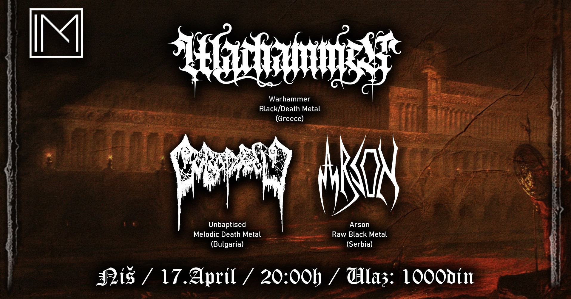 Niški klub Istina Mašina u petak 17. aprila postaće epicentar balkanskog andergraunda. U okviru evropske turneje „Death, Fire and Soil”, niška publika će imati priliku da čuje grčki Warhammer, bugarski Unbaptised i kruševački Arson. Ovaj tromeč donosi presek savremene black, death i doom metal scene regiona.
