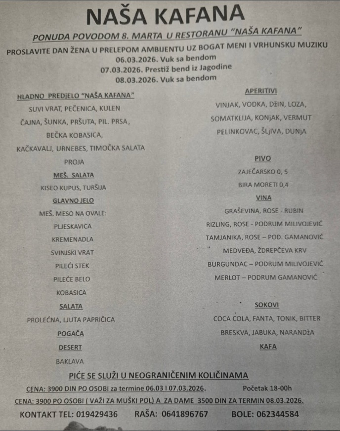 Razervacije na broj telefona: 019/429-436 ili lično u Našoj kafani, ul. Ljube Nešića 107, Zaječar