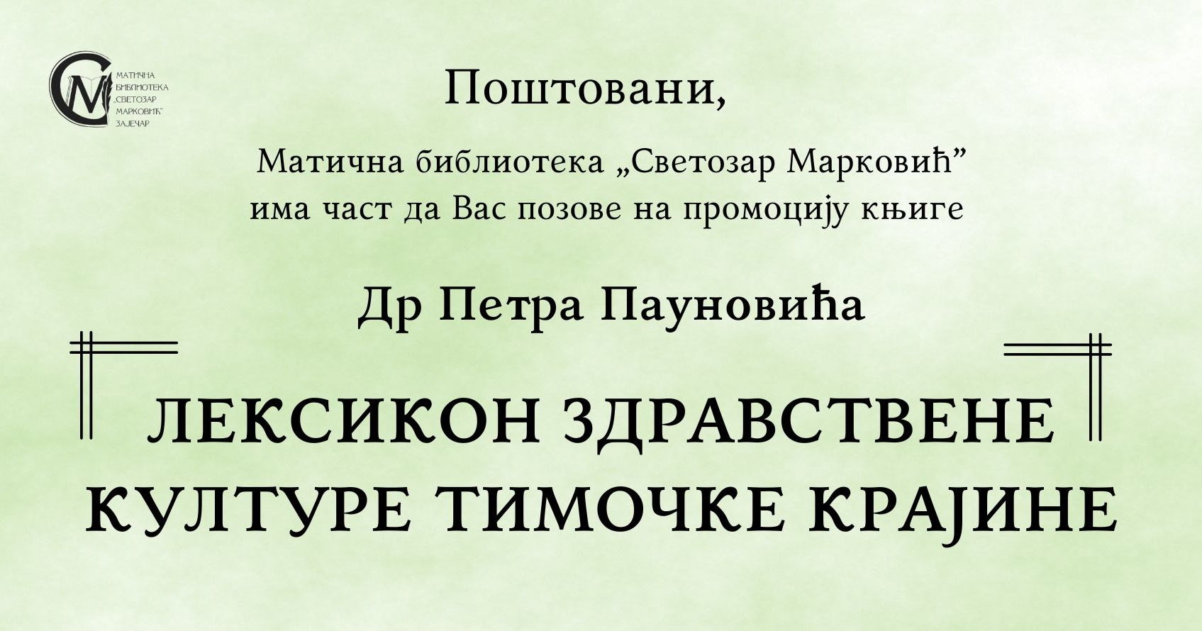U čitalištu Matične biblioteke „Svetozar Marković“ u Zaječaru, u četvrtak, 9. oktobra, biće organizovana promocija knjige dr Petra Paunovića pod nazivom „Leksikon zdravstvene kulture Timočke krajine“. Na promociji će govoriti autor knjige, dok će moderator biti Tamara Brajković. Početak je u 18 sati