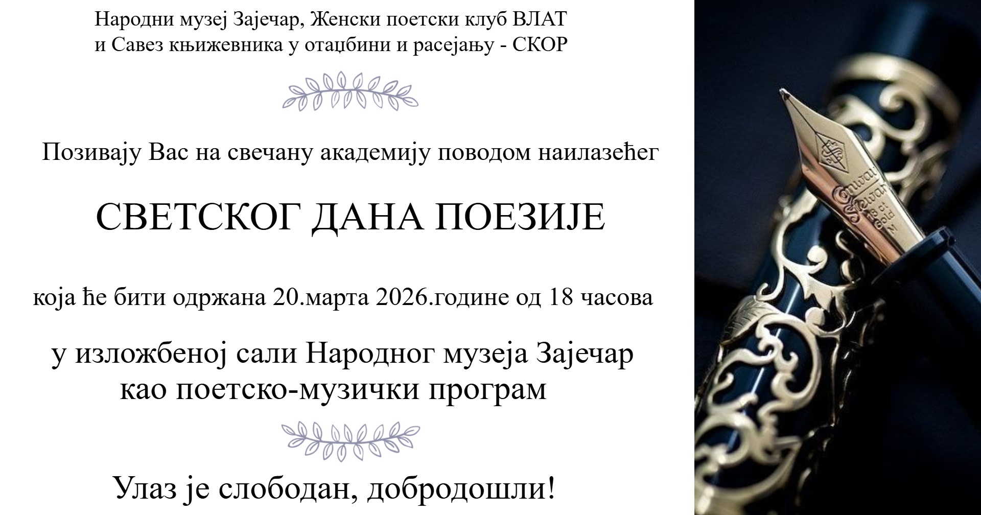 Narodni muzej Zaječar u Zaječaru, Ženski poetski klub „Vlat“ iz Zaječara i Zaječarski ogranak „Saveza književnika u otadžbini i rasejanju – SKOR“ pozivaju Zaječarce da svojim prisustvom uveličaju svečanu akademiju povodom nailazećeg Svetskog dana poezije.